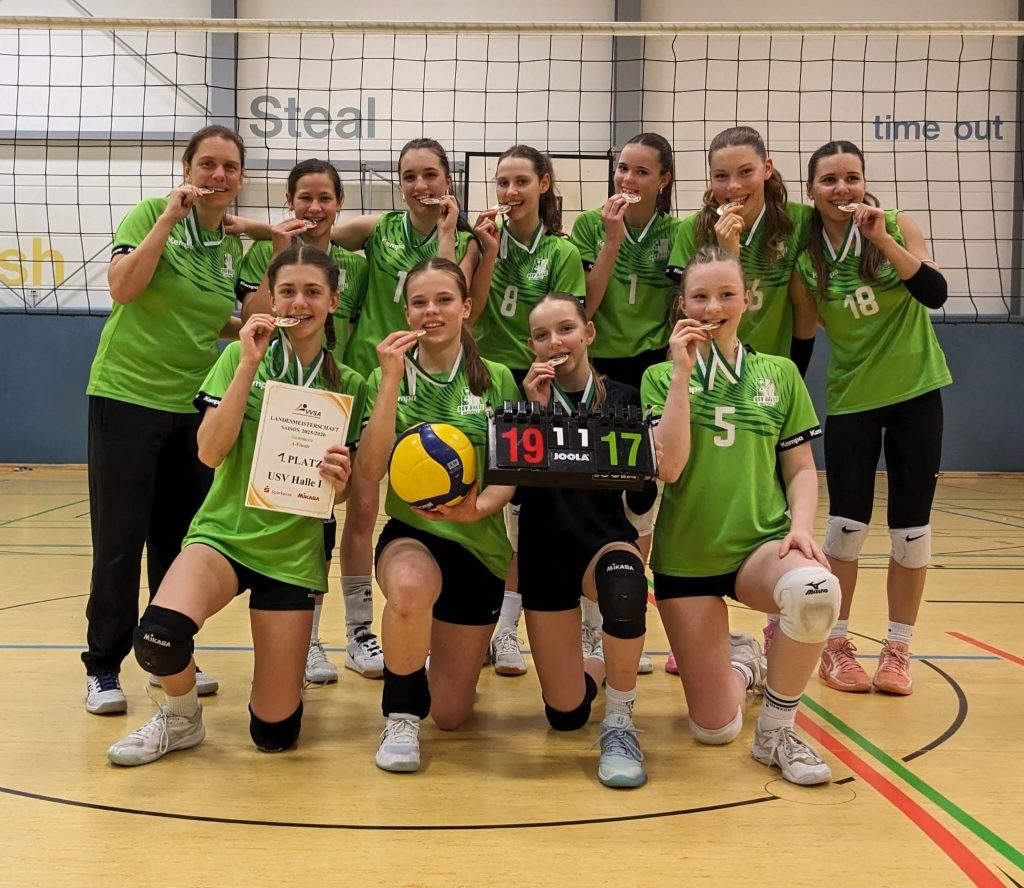 Packendes Finale mit dem Sieg für unsere U 16-USV-Mädels Die U16 des USV Halle 1 gewann am Samstag (21.3.26) den Landesmeistertitel. Nach einem souverän gespielten Turnier, holten sich die Mädels in einem wahren Volleyballkrimi den Titel (19:25; 26:24; 19:17). Nun geht es bei den Nordostdeutschen Meisterschaften weiter gegen die Sieger und Vizemeister aus Berlin und Brandenburg.